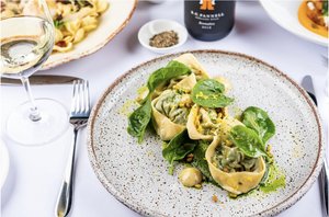 George on Weymouth menyajikan hidangannya di ruang makan terbuka, dengan linen putih dan balok kayu terbuka, di mana menunya menawarkan berbagai hidangan laut, salad, dan makanan penutup lezat yang terinspirasi oleh masakan Mediterania.